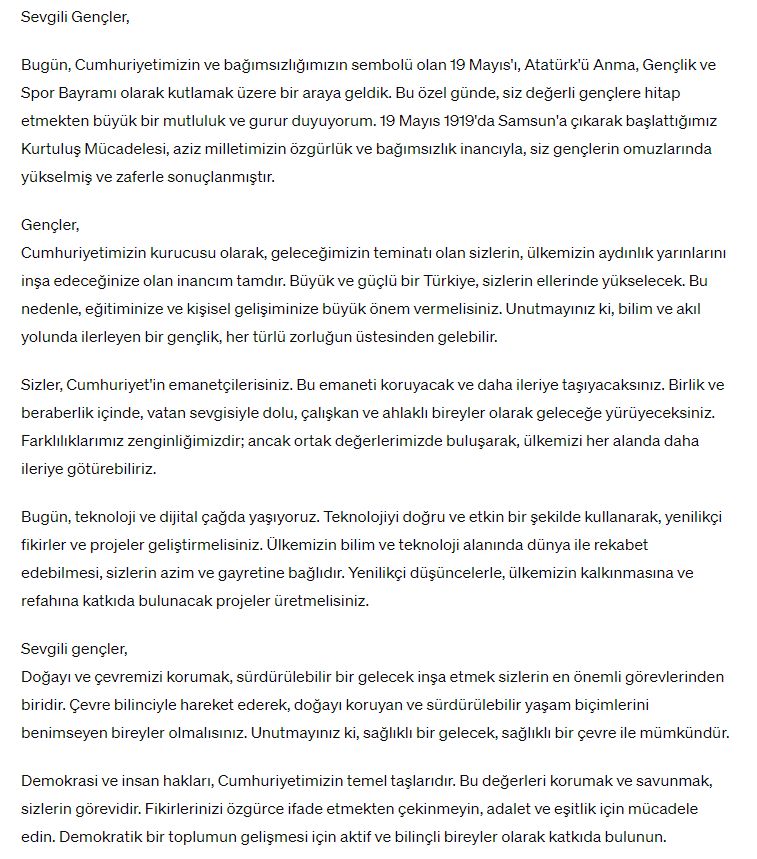 19 Mayıs Gençlik ve Spor Bayramı kutlu olsun! Atatürk yaşasaydı Türk Gençliğine ne söylerdi? Yapay zeka ile kurgulanan bu özel mesajı ve bayramın anlamını keşfedin.